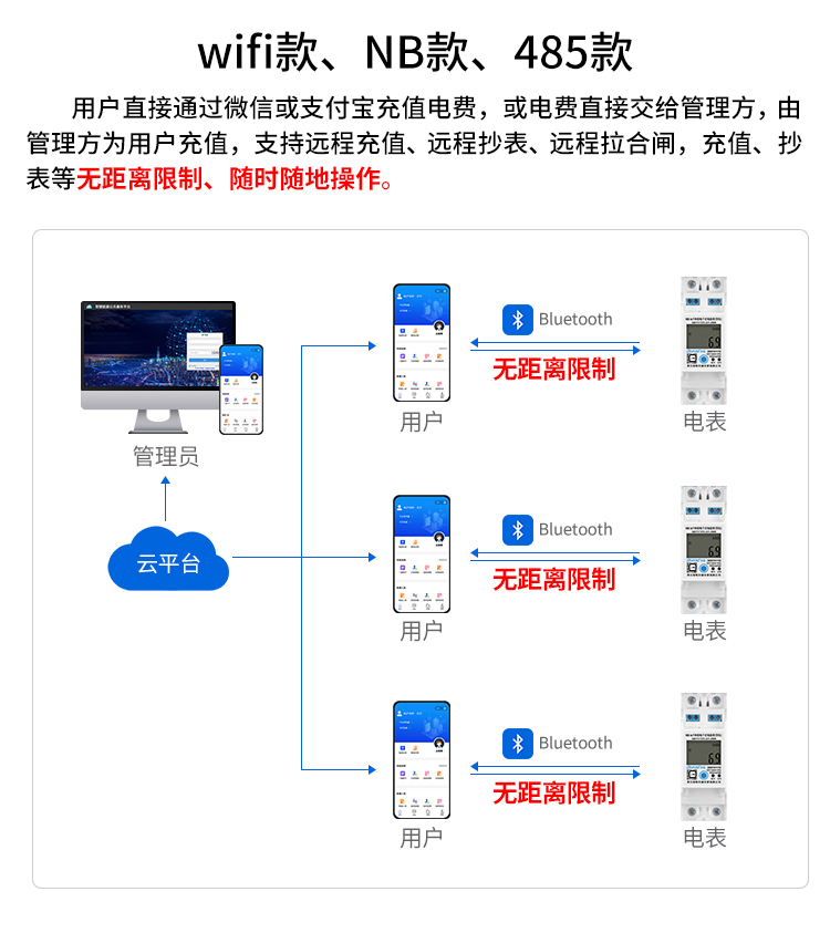 本公司DDSY6111/DDZY6111遠(yuǎn)程智能電表與本公司遠(yuǎn)程抄表系統(tǒng)和手機(jī)APP配套使用,遠(yuǎn)程抄表管理系統(tǒng)具有實時抄表、定時抄表外,還提供了設(shè)備管理功能,如告警、余額短信通知、遠(yuǎn)程充值、手機(jī)抄表、手機(jī)查詢、手機(jī)充值、預(yù)付費、后付費、自助充值機(jī)充值、遠(yuǎn)程拉合閘、各種查詢報表、統(tǒng)計報表下載等功能。